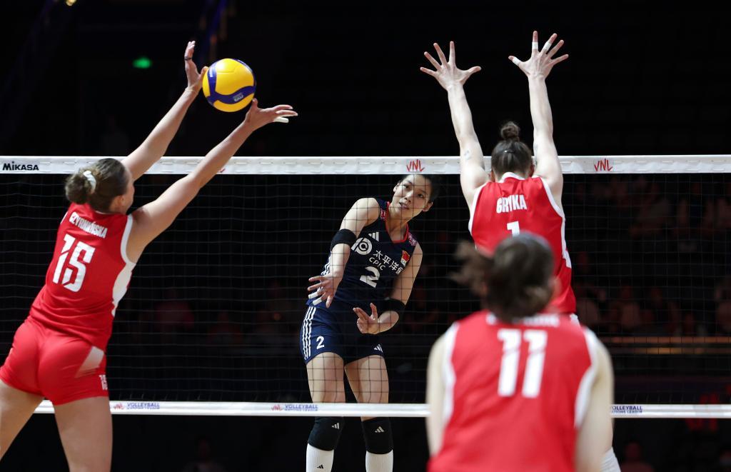 图为6月5日在北京举行的2025年世界女排联赛(中国北京站)小组赛中,中国队对阵波兰队的画面。新华社记者 雒圆 摄