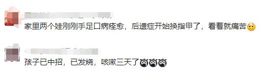 还有家长心疼地分享娃的症状“发烧、咳嗽”“后遗症开始换指甲,看着就痛苦”。