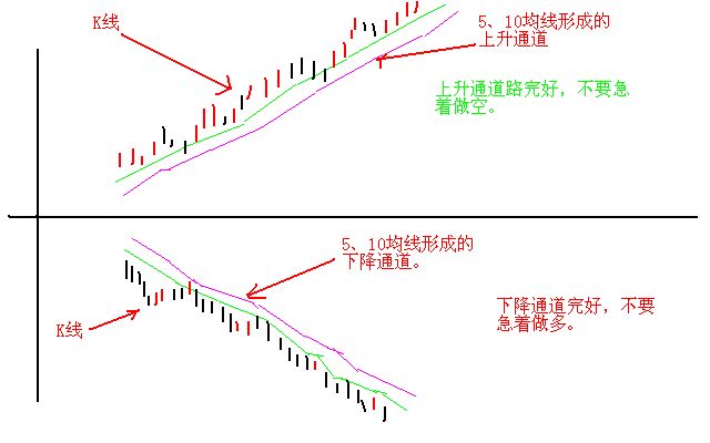 条件1、3、5分钟图上,5、10均线所形成的通道完好。2、K线还没有形成较为明显的靠线。
